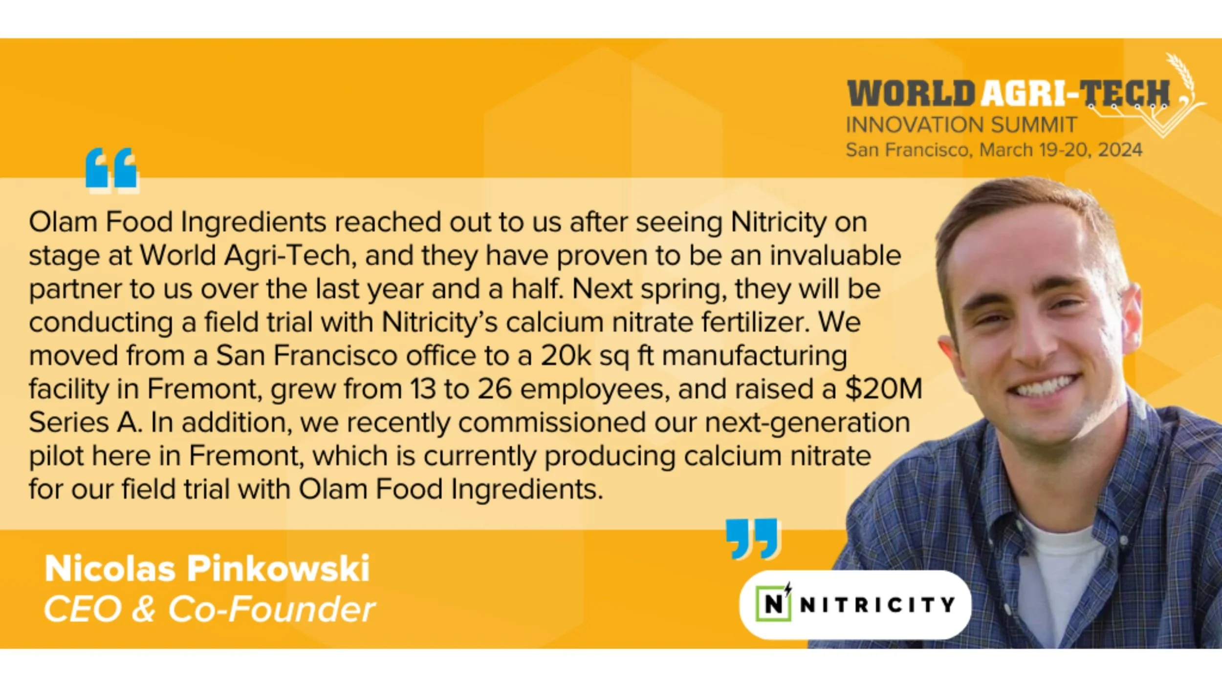 FREMONT, Dec. 4, 2023 – CEO, Nicolas Pinkowski, shared the latest updates about Nitricity since pitching at World Agri-Tech Innovation Summit.